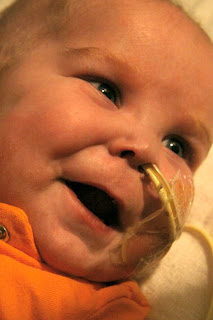 We were asked to come in and see the doctor and told to pack for a few days on the ward - just in case. But after a brief consult with Dr. Human, who confirmed our suspicions that Ford was indeed looking pretty bad, it was decided that the ICU would be a better choice for two reasons. The first being that they can keep a closer eye on him there than on the ward. If his condition takes a turn for the worse overnight they'll be in a better position to help him. The immediate plan for his treatment is to up his dosage of diuretics to see if he'll pee off some of the excess fluid, get him on some minimal oxygen support to help his breathing, test for viruses that might be making him sick (he's already had his seasonal flu, H1N1, and RSV shots), and then sit tight and see if he improves. The second reason is that apparently during Cardiology's last big, collective meeting they brought up (unbeknownst to us) the problem of Ford and what could/should be done to help him. It turns out they are not quite as thrilled with his progress as we are (we tried to impress on him how amazing Ford's smiling is, but he wasn't having any of it) and that his failure to thrive over the last 6 months complicates their long-term expectations.