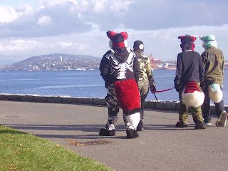 Drink it in, y'all! Oh, to be able to go strolling in Stanley Park!! Actually it's been a pretty sweet day weatherwise in E-town too, so I'm not going to complain. Thank you for sharing your outing. You look really good, guys. The Ford's-eye-views of Hallowe'en heights and hind ends are nice too. And it's an irresistible temptation to mug alongside exhibits at museums, zoos, and the like, isn't it, Ford? I never miss a chance, myself! It's so good to know that you three are all at home, and out & about. Enjoy!!! Lots of love and best wishes from me.