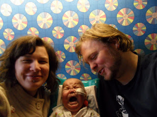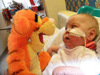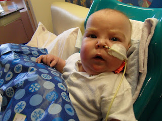 christmas in the hospital wasn't so bad. nick woke at the ronald mcdonald house to a garbage bag full of presents for Ford and here at the hospital, i woke to teddy bears tucked into Ford's crib and later Santa walked the halls handing out more giant bags of gifts for the kids. not that Ford noticed the pressies, but he certainly noticed Santa and wouldn't take his eyes off him: