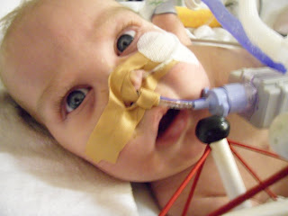Despite the changes Ford seems to be holding his own. Not only does he treat the breathing tube as though it's not even there, he spent the day wide awake and full of smiles - happily kicking his legs and playing with our faces, even sitting up in my lap for an hour, enraptured with the new perspective on the comings and goings in this room. It's clear he really doesn't know or care about what we feel he's missing, as long as there is someone around to pat his bum and talk to him - and his simple joy in the world is remarkable to experience in situations like these.